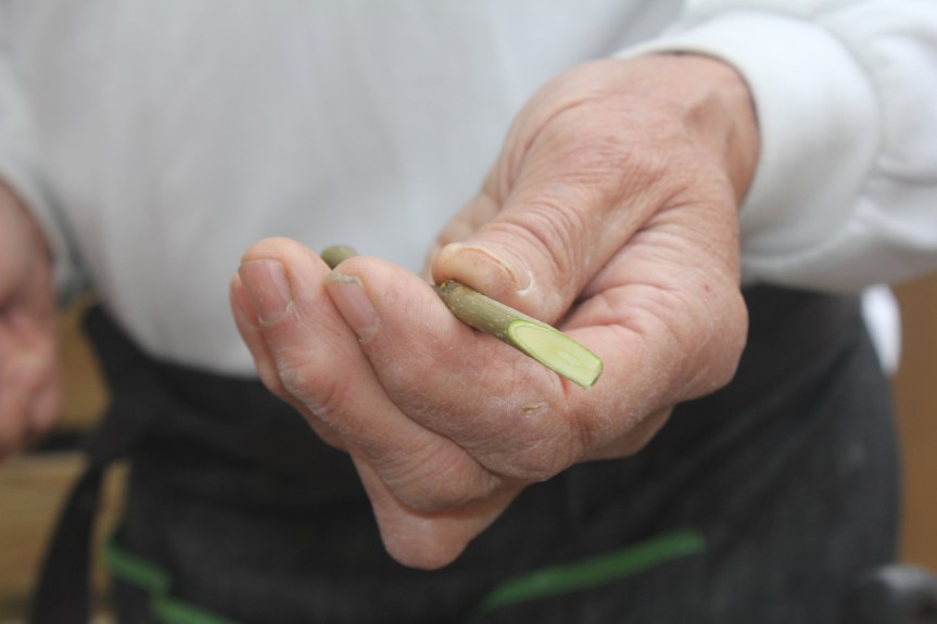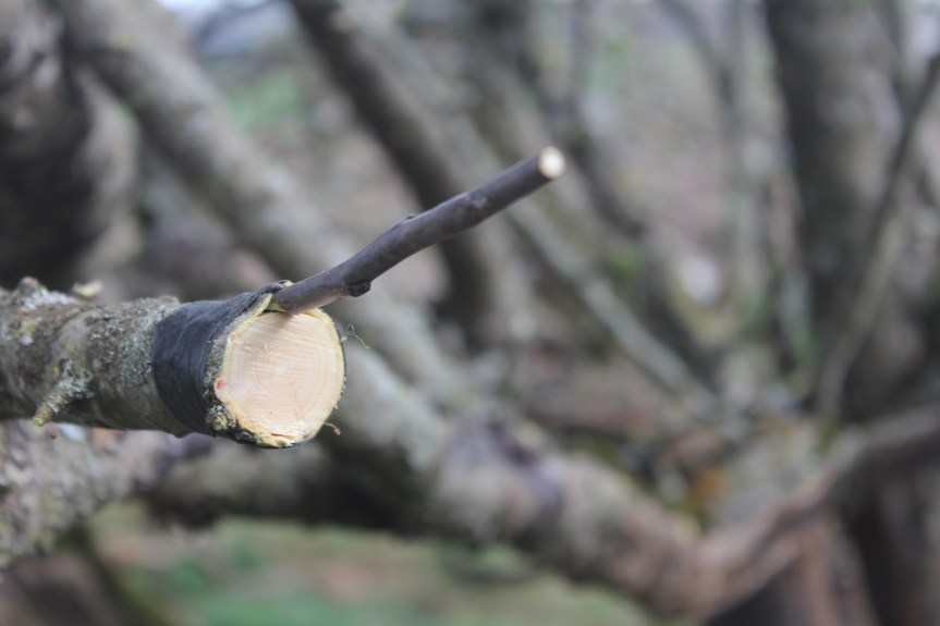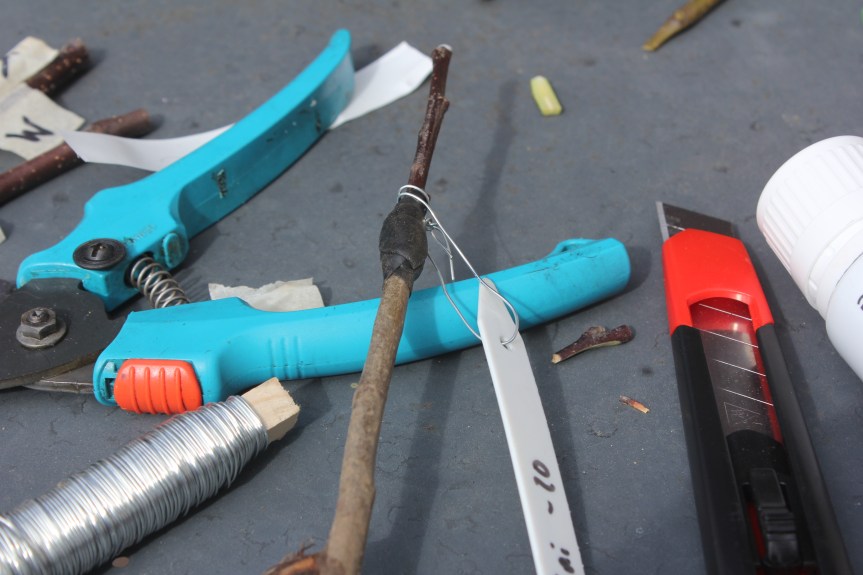 Det svåraste i hela ympningen var att göra fina raka snittytor som sluter tätt mot varandra. Därför fick kursdeltagarna först öva på vattenskott av päron. Det är viktigt att kambiumskikten (det ljusgröna innanför barken) kommer i kontakt så att ytorna kan växa ihop. När snitten passar fint ihop lindas tejpen fast för att hålla allt på plats och alla öppna snittytor behandlas med ympvax eller sårbalsam, innan de märks upp och plastpåsen dras på.