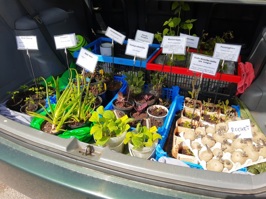 Alla hade laddat upp med växter, knölar, krukor eller frö. Det byttes tom ägg från lyckliga lanthöns.