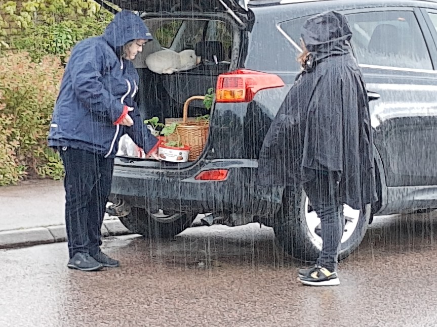 Det var smart eftersom vädret visade allt från sol, häftig blåst till ösregn. Men garvade odlare låter sig inte avskräckas av vädret, så det föregick ett livligt växtbyte, självklart med Corona-avstånd.