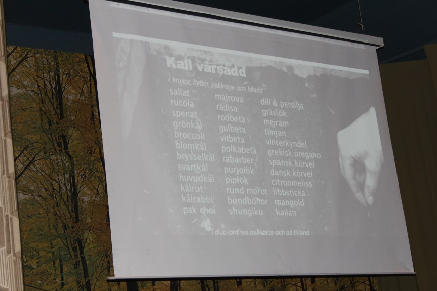 Permakultur kan förklaras och benämnas på många olika sätt, men ett är ”Hållbara system och beteenden med naturen som förebild”. Riquette berättade om permakulturens övergripande principer med omsorg om jorden, omsorg om människan och rättvis fördelning och om olika permakulturisters synsätt och idéer, där både hand (praktiskt experimenterande), hjärta (älska platsen och människorna där du bor) och huvud (använda principer och tekniker) fanns representerat. Principer kan vara att sluta kretslopp och inte skapa avfall, att skapa gynnsamma kopplingar mellan allt i ett system (tex i en trädgård), att ta tillvara och fördröja energiflöden (tex sol, vind, vatten, näring…) och att skapa små och långsamma lösningar istället för att göra stora och snabba förändringar.