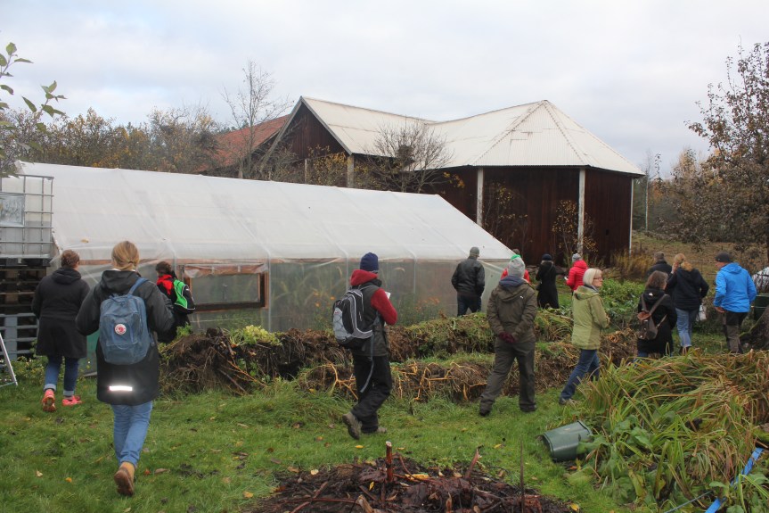 Efter lunchen visade Riquette sin stora trädgård. Där fanns resterna av det gamla systemet med stora grönsaksodlingar i samarbete med grisar och får, den nuvarande lite mindre (men fortfarande stora!) odlingen, den spirade starten på ett nytt system med alléodling av träd, samarbete med höns och stort fokus på att bli självförsörjande på växtnäring utan djur genom att bland annat odla mycket kolrika växtslag, samt den helt nya köksträdgården uppe vid huset.
