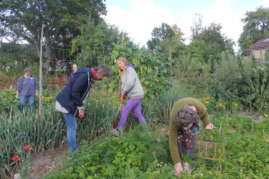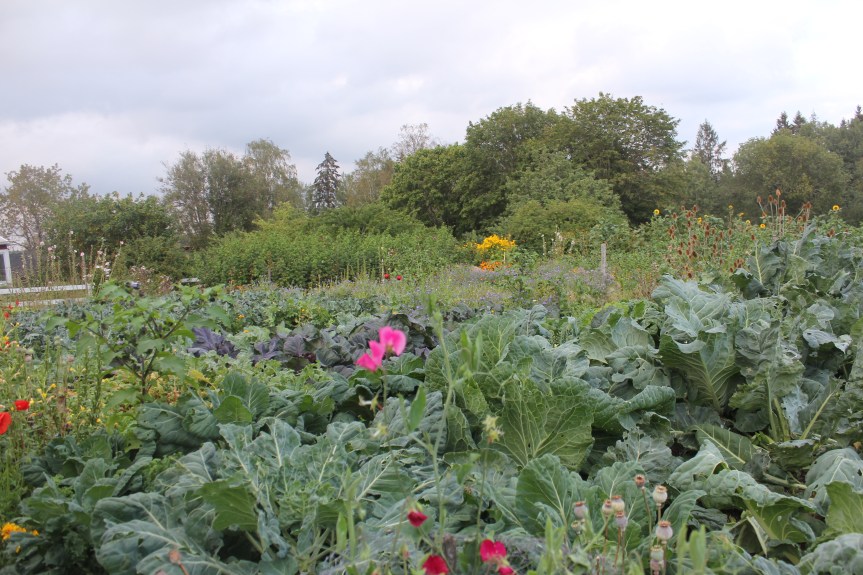 Kvällen den 29 augusti fick ca 20 odlingsintresserade en guidning i Marie Johanssons fantastiska trädgård i Hattsjöhult. Trädgården är 4000 kvm stor och hälften utgörs av självplocknings- och visningsträdgården, bestående av 4 stora avdelningar med växtföljden kål – potatis – morötter – övrigt (tex lök, rödbetor och bönor). Trädgården är i princip grävfri, jorden är ständigt täckt av organiskt material och överallt i bäddarna växer självsådda blommor.