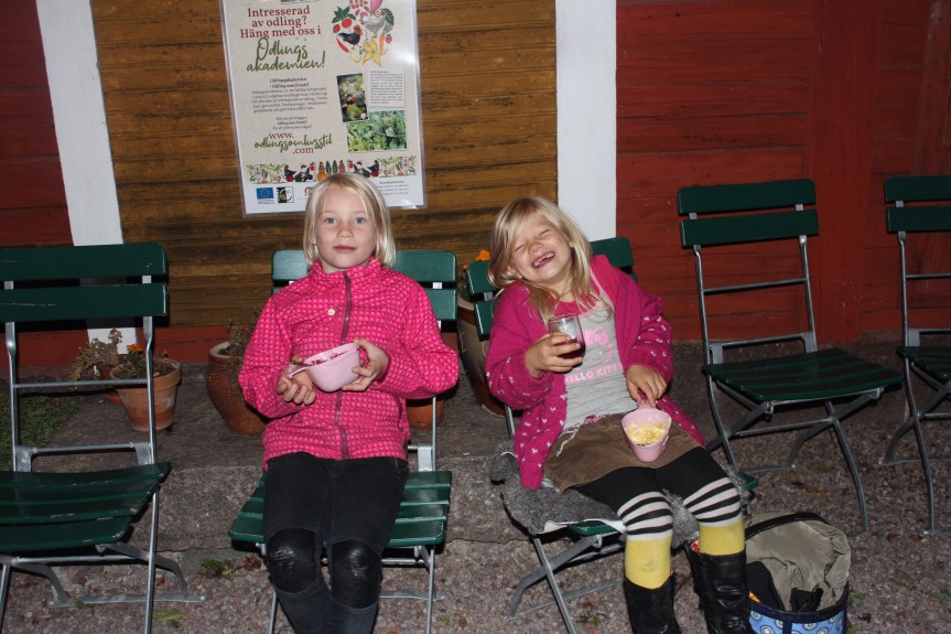 När det började skymma var det dags för efterrätt. När alla njutit av mat, fika och kaffe/te höll Hillevi Helmfrid och Mattias Eliasson en inspirerande föreläsning om projektet, odling, hållbarhet och livsstil. Kvällen avslutades med musik av Kicki Willysson, Matts Hansson och Tord Johansson.