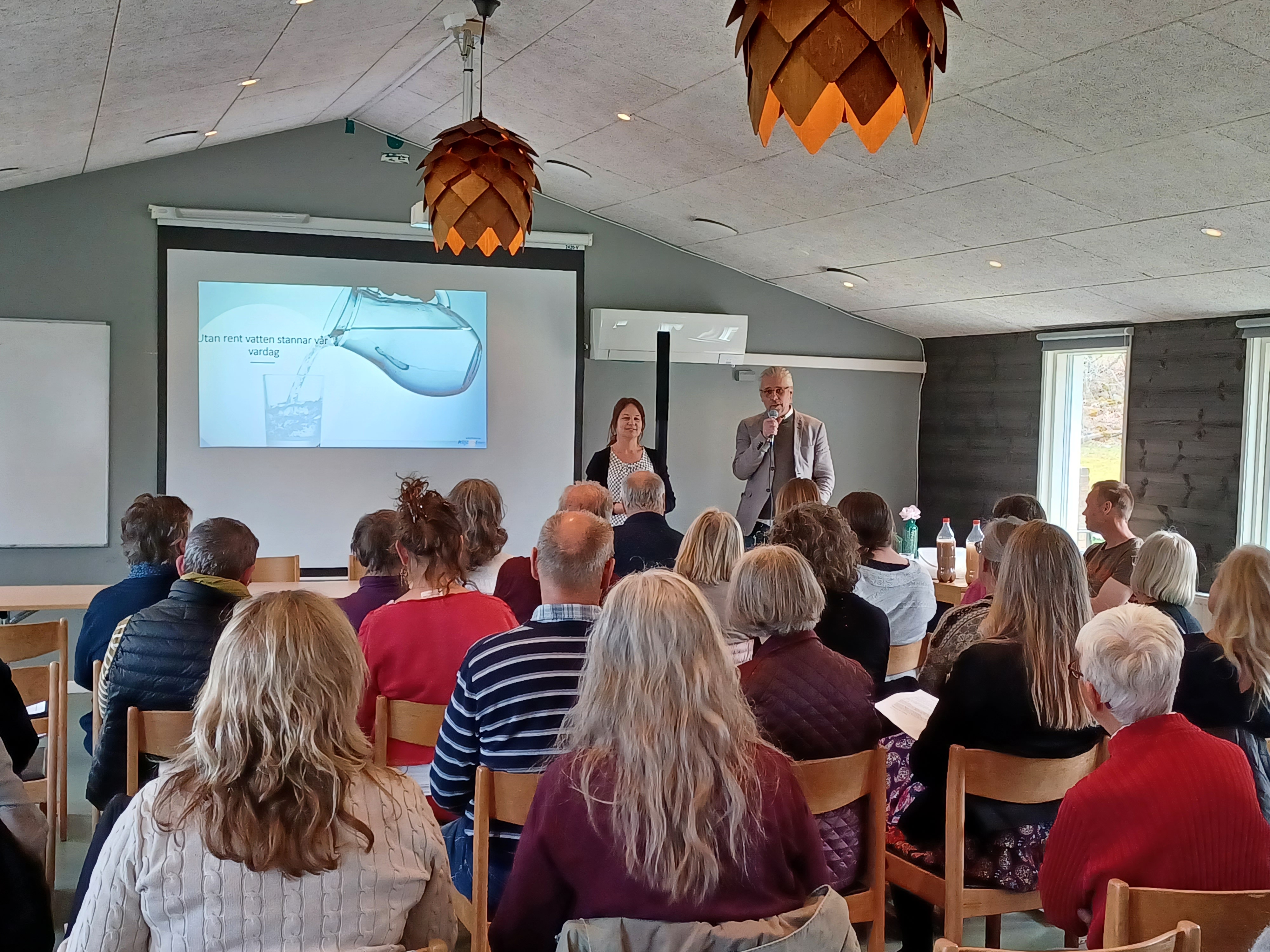 I nuläget tar Västervik sitt dricksvatten från sjön Hjorten. En ny vattentäkt i Edsåsen prospekteras men det kommer dröja länge än innan den kan tas i bruk. Till dess fortsätter balansgången kring Hjorten där både tillgången och kvaliteten minskar långsamt över tid. Suzan Nilsson och Ruben Öberg från Västervik Energi och Miljö (bild) berättade att de återkommande bevattningsförbuden är ett nödvändigt och kraftfullt redskap för att bromsa sänkningen av vattenspegeln när den når kritiskt låga nivåer på sommaren. Att göra undantag från bevattningsförbudet för husbehovsodlare som tillämpar vattensnål odling med droppbevattning och täckodling, något som efterfrågades från publiken, var inte aktuellt enligt Nilsson och Öberg, även om de lovade ta med sig frågan hem och fundera på den.