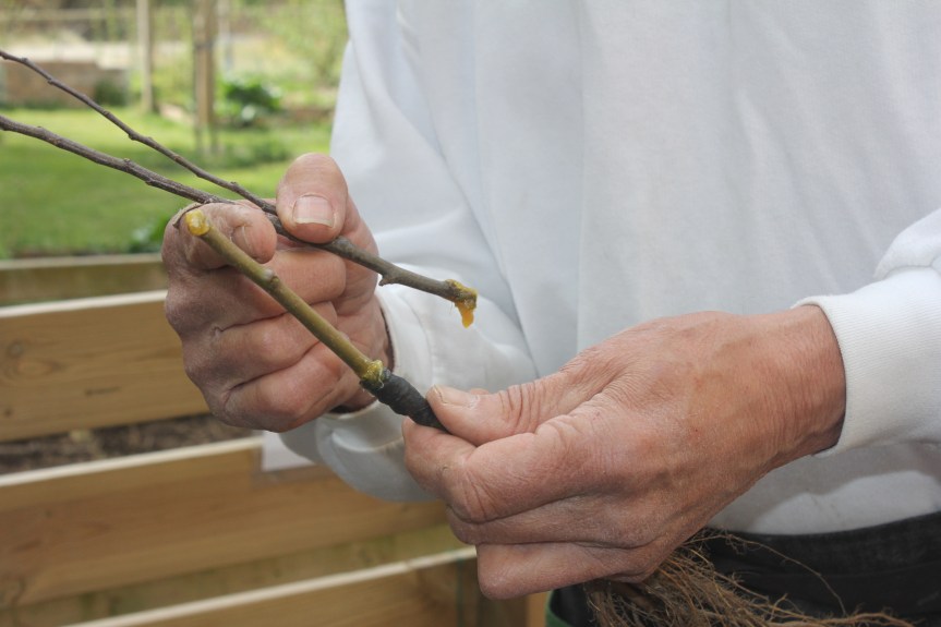 Här visar Björn ett bladöga på en redan ympad kvist. Glöm inte ympvax i toppen av ympen! Björn använder en liten grenbit för att smörja på vaxet.