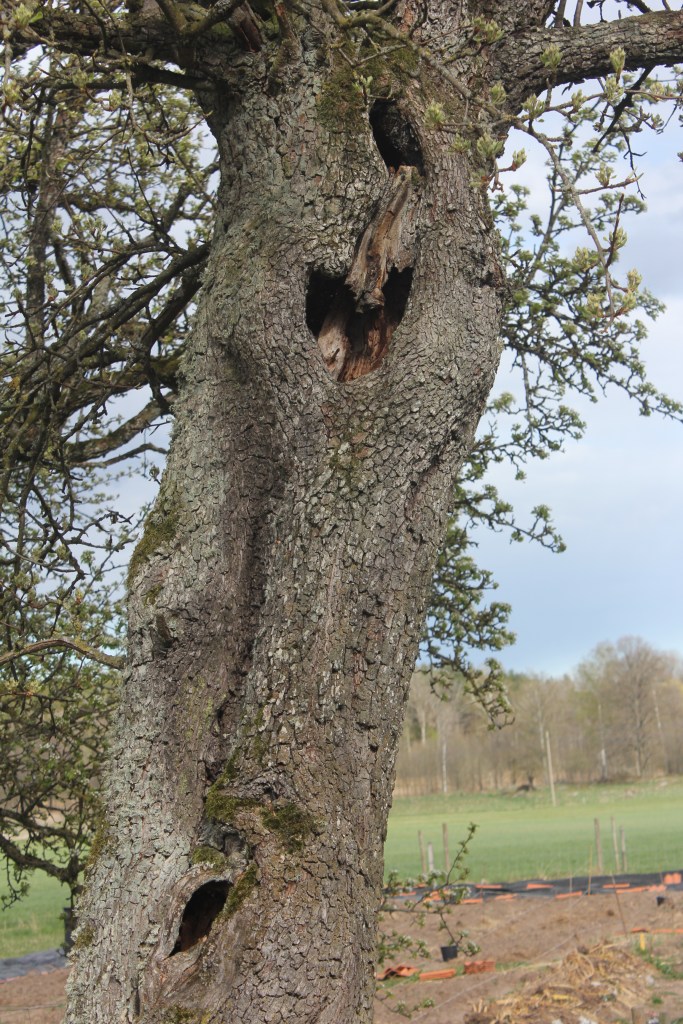 Spara gamla träd så länge de ger frukt, säger Björn. Det gör ingenting om de är ihåliga och murkna inuti. Själva livskraften i trädet sitter precis innanför barken, i kambiet. Sätt inte heller igen hålen med något, men det kan behöva göras ett litet hål för dränering nertill. Ta bort alla stamskott och beskär trädet för att stimulera tillväxt, men ta inte för hårt på en gång. Låt det ta flera år!