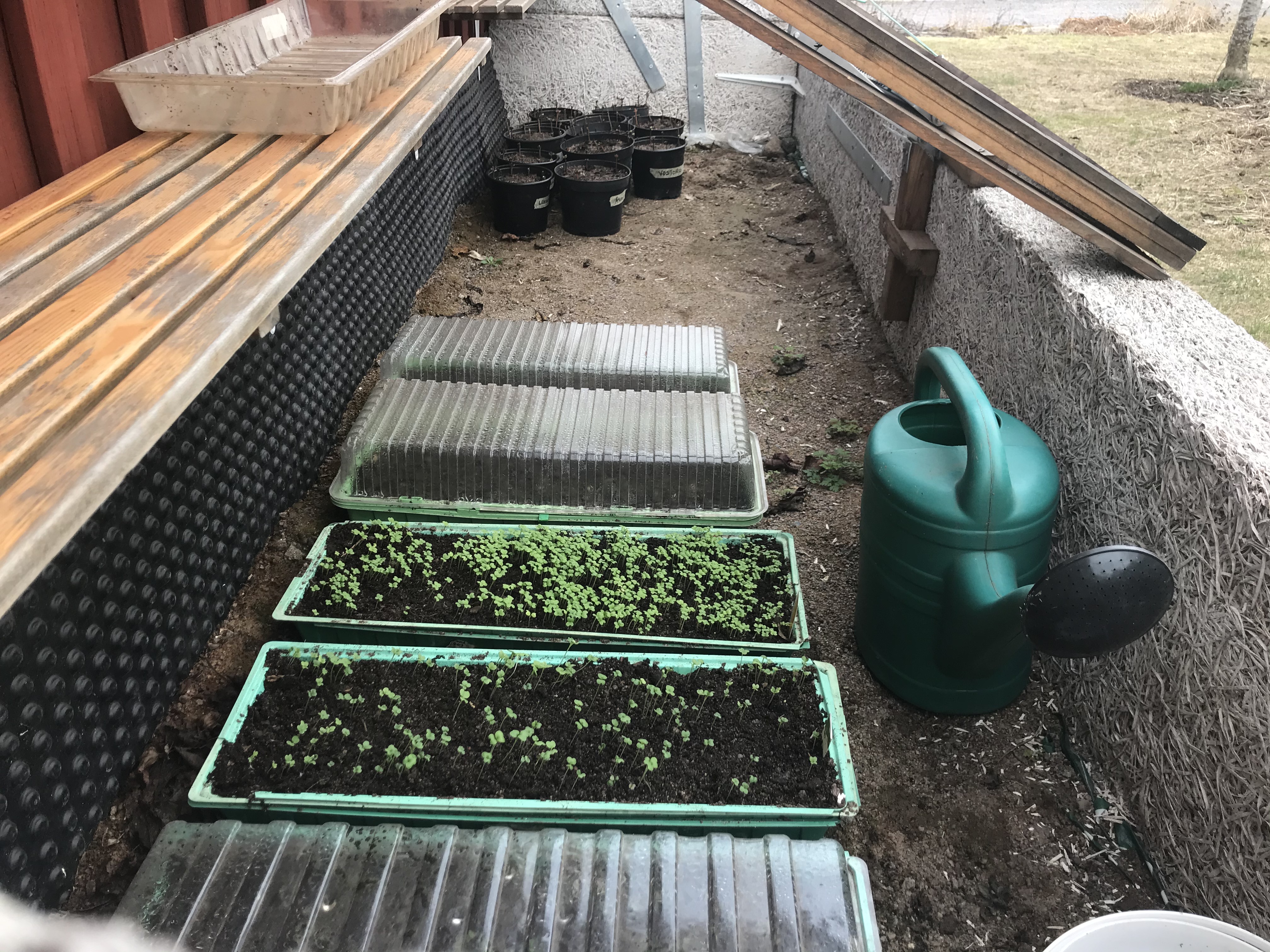 Så skönt det var i helgen att stänga ute nordanvinden och i växthuset så de köldtåliga bladgrönsakerna. Soliga dagar blir det rejält varmt därinne så jag tror på en snabb groning nu när jorden hunnit bli varm.