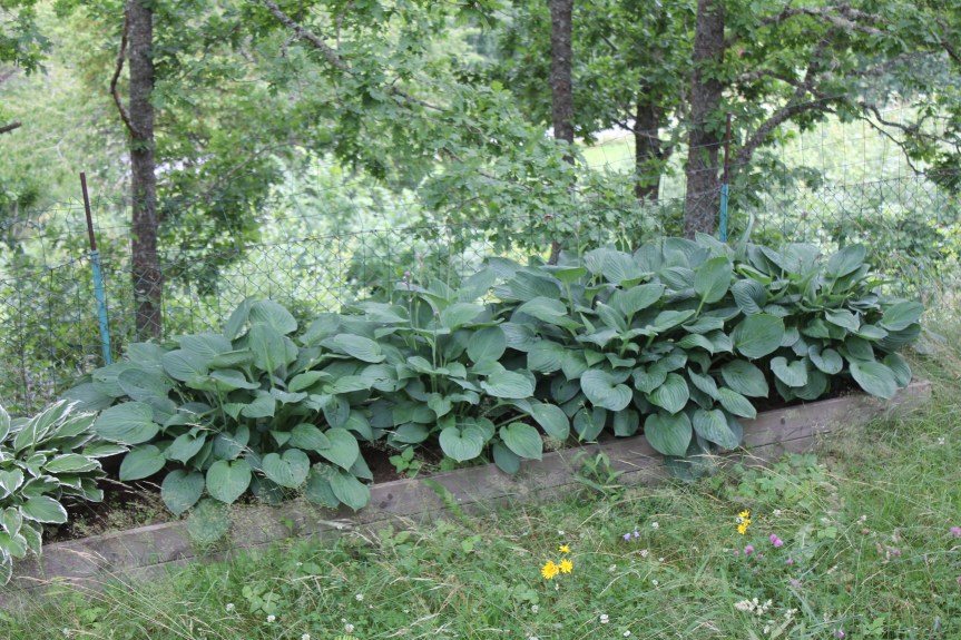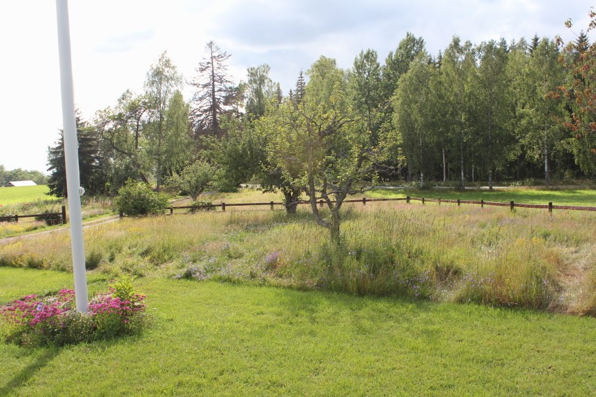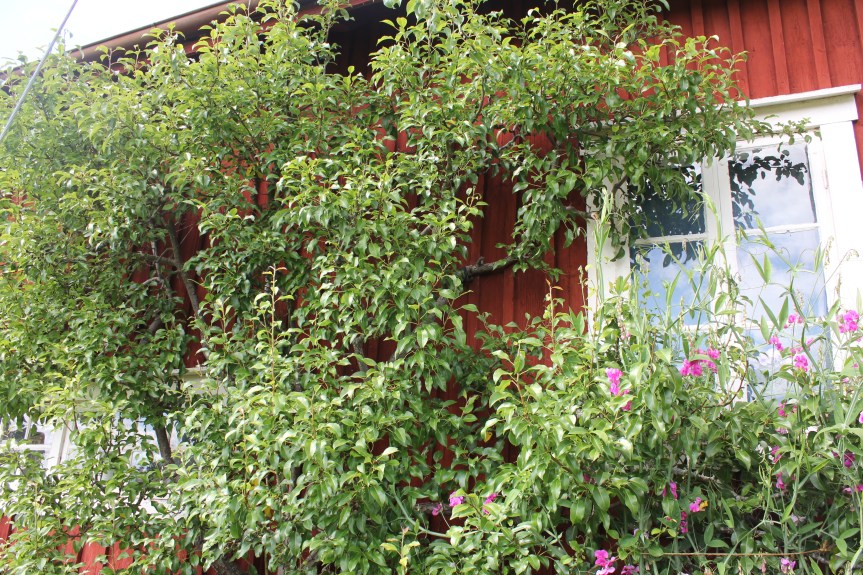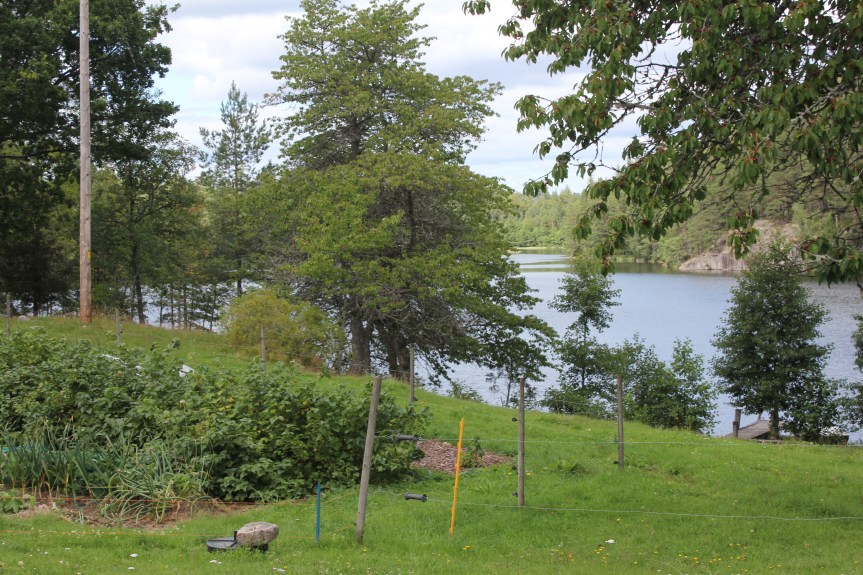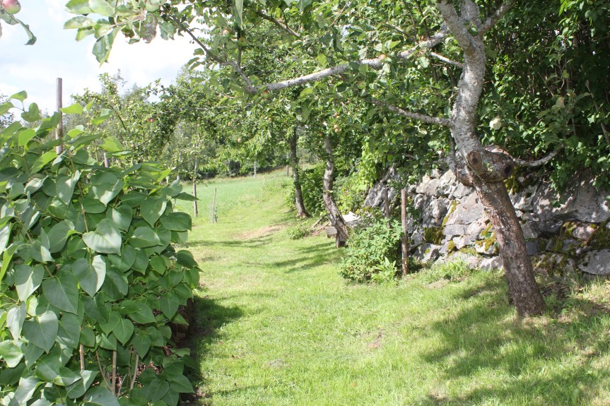 Under det här trädgårdsbesöket pratade vi om att rama in odlingarna med nät för att skydda mot hare, rådjur, vildsvin mm och kanske plantera buskar och träd runt om, på insidan av staketet, för att förbättra mikroklimatet och ge skörd. Man skulle kunna skapa ett eget område för perenna grönsaker i ena kanten av odlingen, kanske med hjälp av kompostlimpor och hügelbäddar. Här skulle olika perenna lökar, sparris, perenna bladgrönsaker, blommor mm kunna växa utan att påverka planeringen i den anuella odlingen och det skulle kanske även kunna fungera som visningsträdgård.
