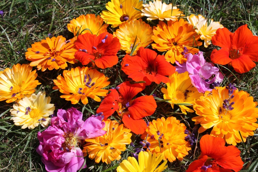 Innan kursgruppen kunde så råg och gröngödsel var vi tvungna att kratta bort gräset och mossan. Mängden organiskt material var så stor att det inte fick plats i min 3 kvm stora kompostbehållare. Jag valde därför spontant att göra en upphöjd vall kring hela min odling där jag bland annat planterade perenna blommor och grönsaker. Det är vackert, lockar insekter och en ger struktur under vintern.