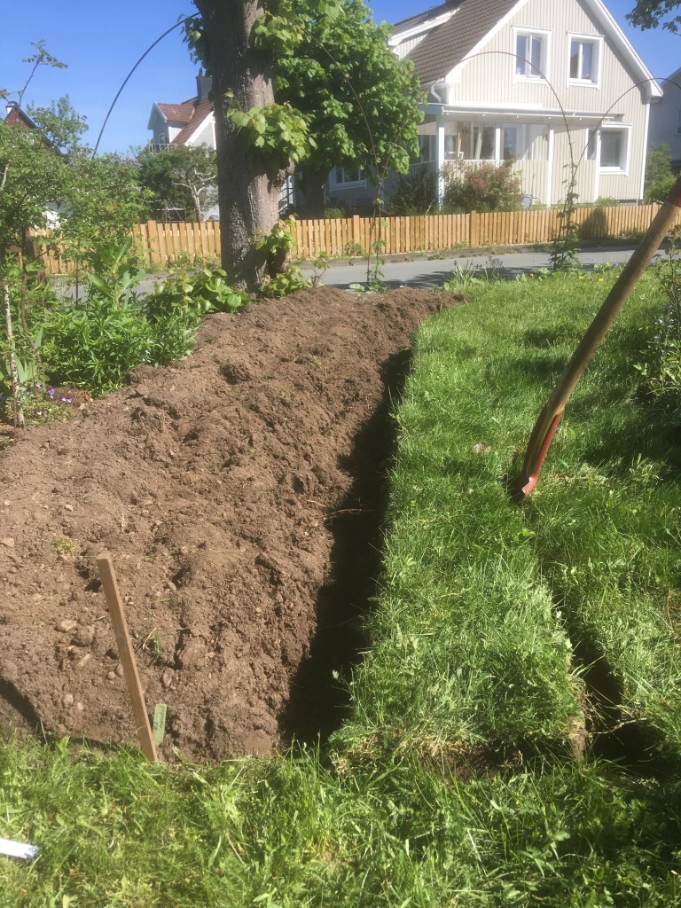 Hela remsan omkring min trädgård ska bli någon slags ’forest edge’ med huvudsakligen ätbara buskar, träd och perenna grönsaker. Växter i olika skikt, blommande växter under hela säsongen, vintergröna växter och växter som skyddar mot vind och insyn. Växtligheten ska inte bara mata och skydda mig, utan även fåglar och insekter.