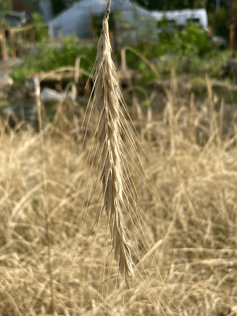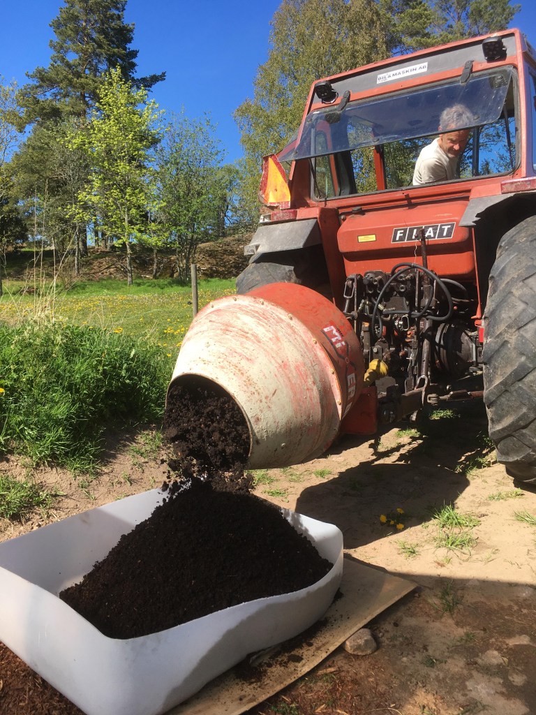 Placeringen av köksträdgården ganska nära de stora gamla träd som finns kring hela min trädgård är ett experiment måste jag erkänna. Bredgreppen gick inte att använda på grund av rötterna nära ytan. Med en tvåhjulstraktor lyckades jag vända gräset och mossan men inte att luckra upp jorden. Kanske att rågen vi sådde under kursen, en växt med djupa rötter, har gjort susen. Om inte så kan jag i alla fall baka bröd, täcka marken under vintern och använda en del som brunt material i min kompost.
