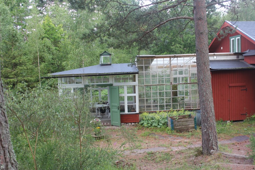 Några röda mattor som vi hittade i uthuset funkade fint för att markera stigen mellan odlingsbäddarna och för att döda gräset. Sticklingar och fröer som jag hade samlat på mig lite överallt hittade en ny plats. Gruset kring huset är min ’plantskola’ där jag regelbundet gräver upp växter. En hög tallved och stubbar som jag ansåg vara bra för insektslivet men inte vackert har jag bl. annat spridit ut under tallarna, täckt med bark och kottar. Nu har jag städat, skapat struktur och en surjordsrabatt.