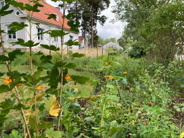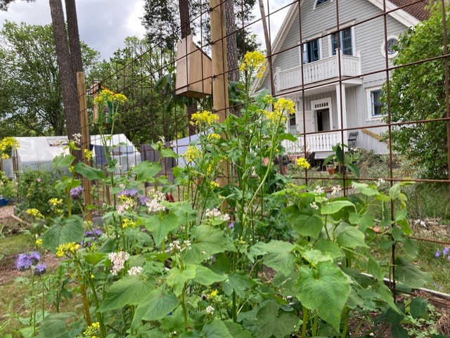 Eftersom jag är otålig har jag redan tagit hälften, ca. 50 kvm, av köksträdgårdens yta i bruk i år. Jag har inte gjort mer än att skapa struktur, krattat jord från stigarna på bäddarna och sått en blandning av grönsaker och blommor. Jag har gödslat väldigt sparsamt, bara lite lucernpellets, för att inte duka buffén för träden. Gröngödsel, täckmaterial och lite kompost är allt jag tänker använda under kommande åren. Mikrolivet får hjälpa till för att luckra upp den kompakta jorden. Det har vuxit fint i alla fall. Experimentet fortsätter under kommande åren.