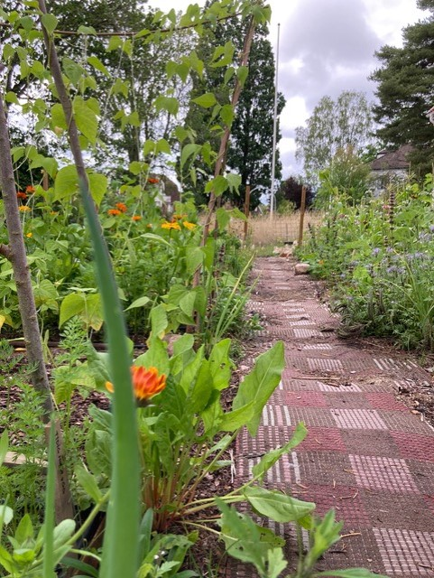I skrivande stund är det ord som kretslopp, återbruk och mångfald som kommer till mig. Jämför jag en gammal bild med några bilder som jag nyligen tog, så är jag positiv överraskad. Vilken skillnad! Allt skapat under höst 2022 och vår 2023 med en liten budget, mycket tid och med hjälp av några kursdeltagare som har förberett min blivande köksträdgård och bidragit med intressanta idéer.