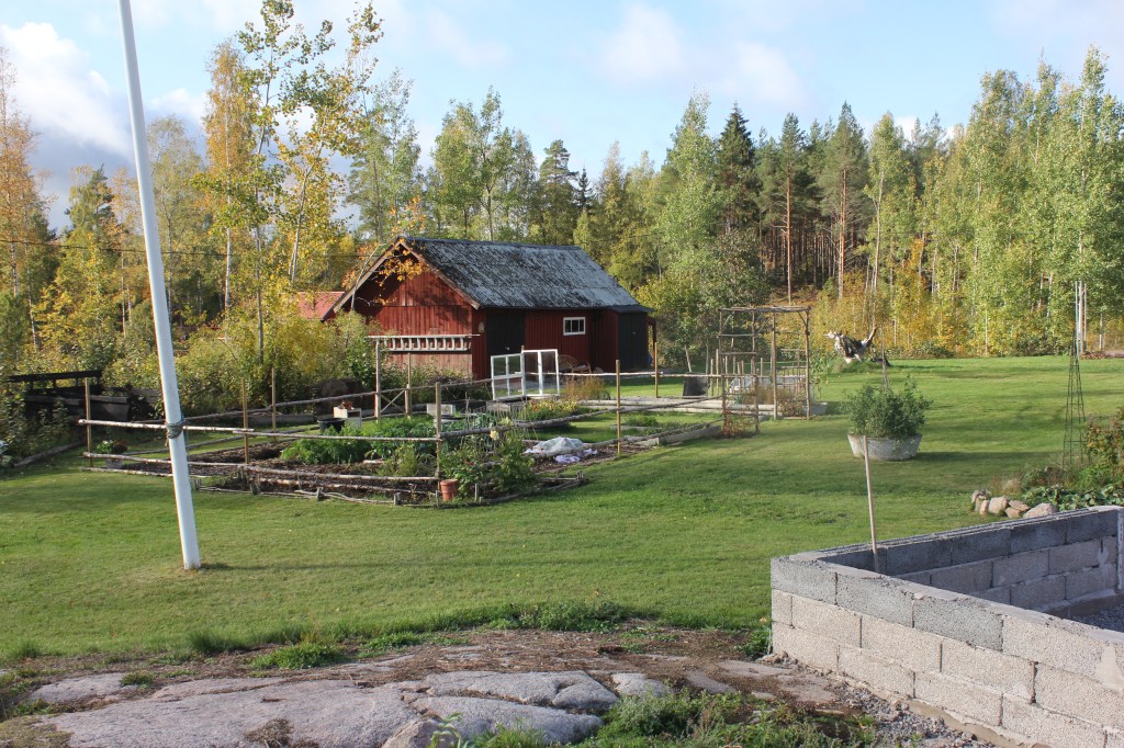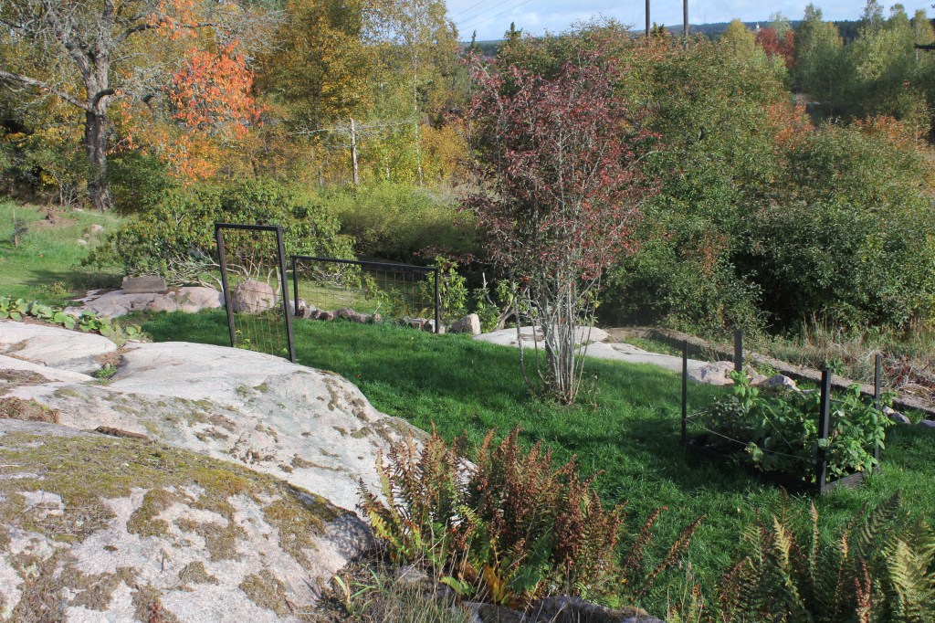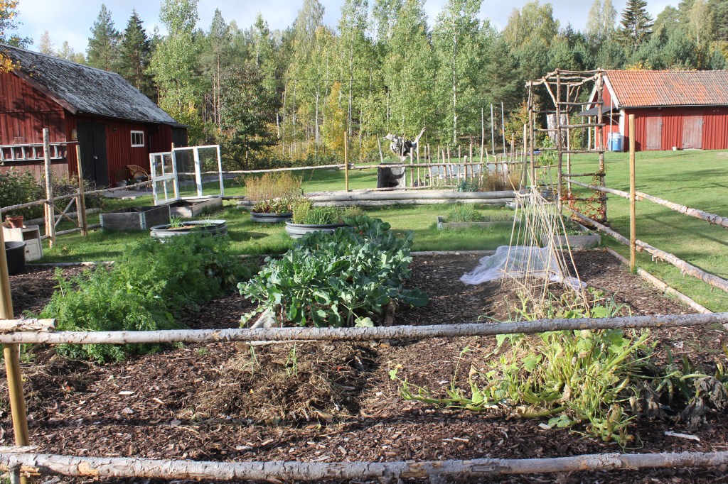 Köksträdgården består till hälften av bäddar med flisgångar emellan, till hälften av ett område med olika slags odlingslådor. Mikaela har odlat potatis, lök, purjolök, morötter, betor, squash, dill, bondbönor, vaxbönor, sockerärtor, majs och mangold. Kålen blev hårt angripen av insekter i somras, men står nu grön och frodig i landet, redo att skördas.