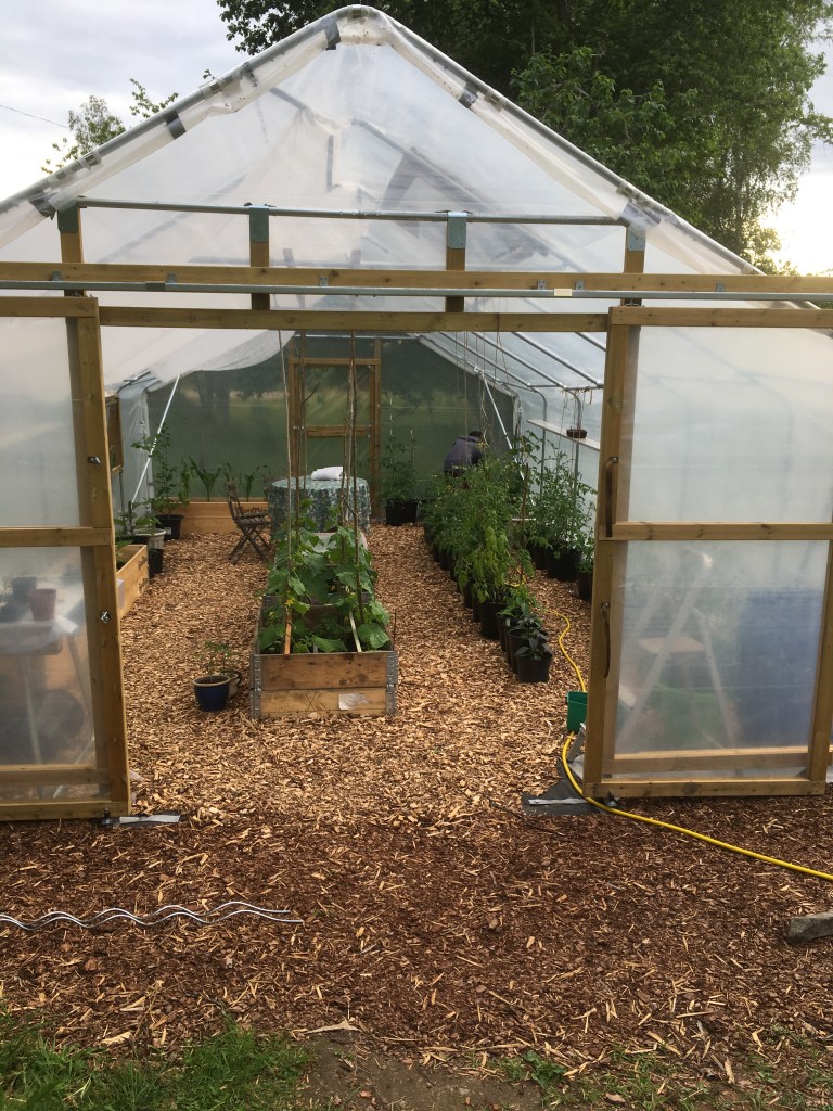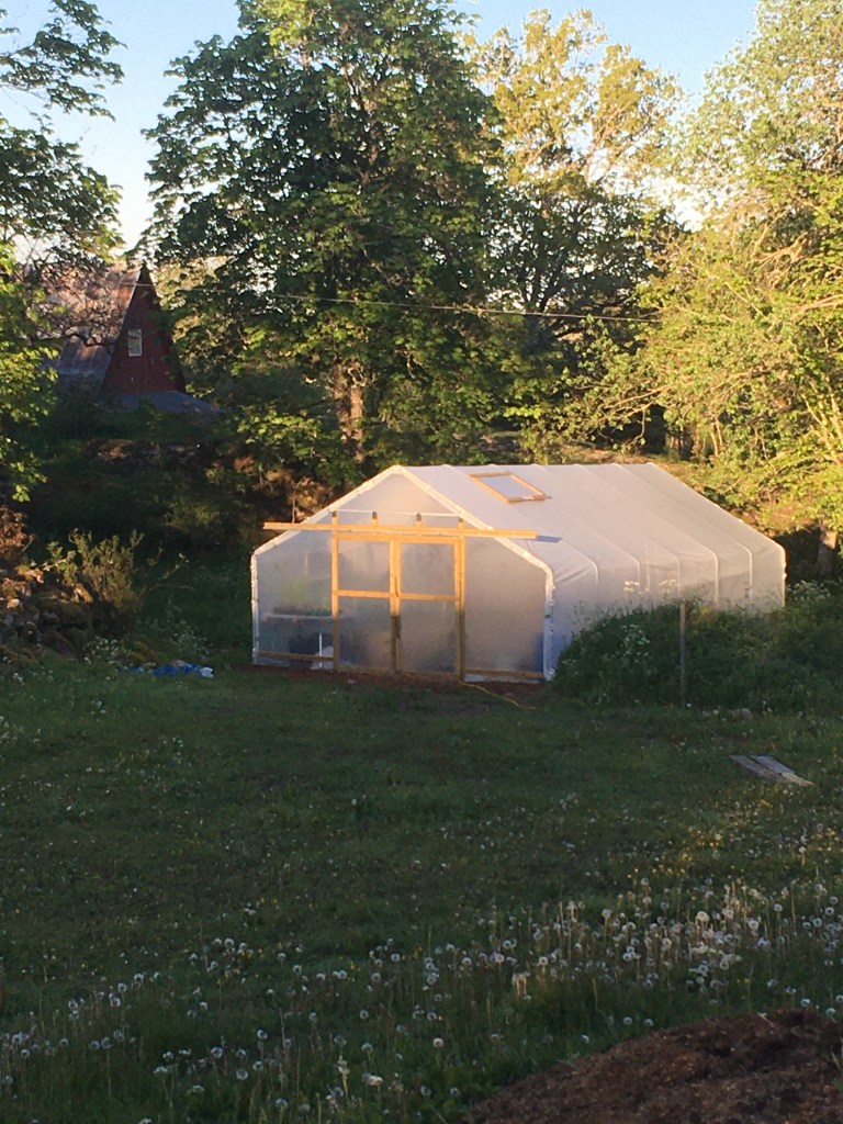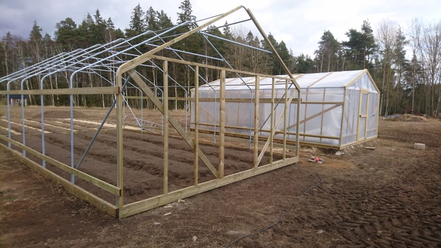 Efter konsultation med Daniel på Gjordnära, så har vi byggt vårt växthus i lutning i längdled och det funkade ju bra även om det sannolikt är lite svårare rent byggnadstekniskt. Vi har grävt ner plasten på ena långsidan och tyngt ner den med sandsäckar på andra för att alternativt kunna ta av den vintertid. Vi är väldigt glada över skjutdörren på ena gaveln och delad dörr på andra, det har funkat bra så långt och är väldigt funktionellt. Likaså två vädringsluckor med automatöppnare, en i respektive vägg och tak.