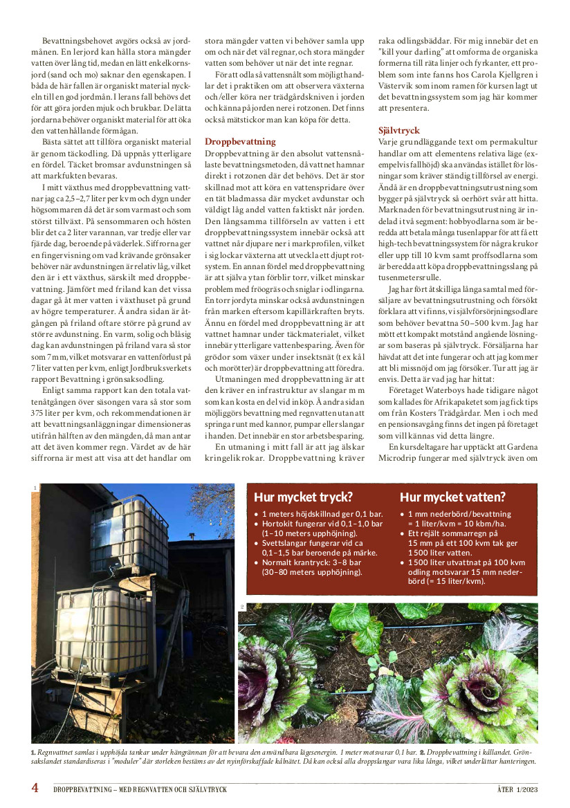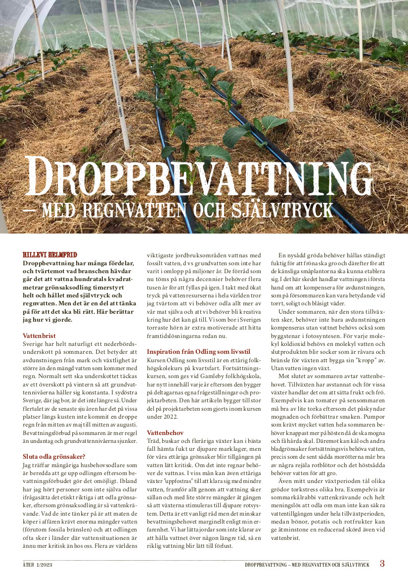 Tillsammans med kursdeltagare i vårt torkdrabbade kustband har jag funderat mycket över vattensnål odling och smart bevattning under senare år. Ett resultat blev den här artikeln i tidningen Åter, en tidning om praktisk kunskap i självhushållning.