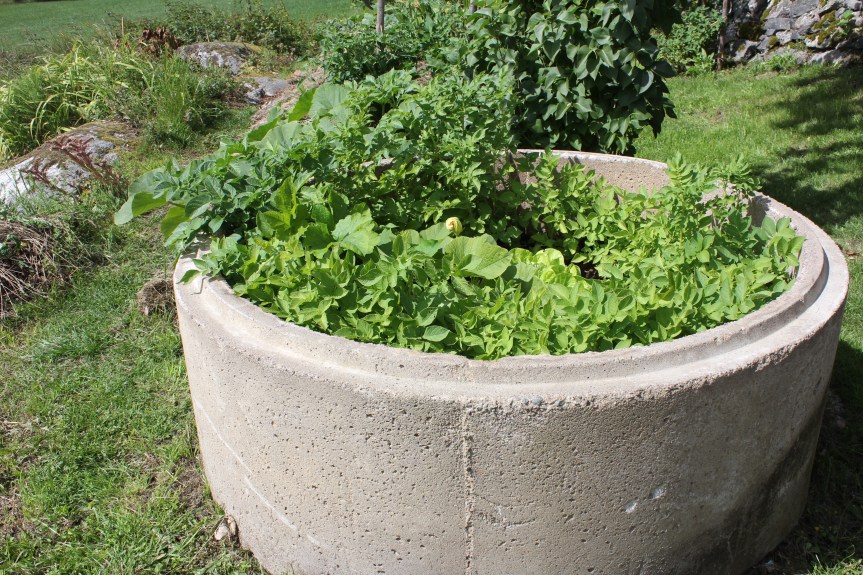 Upphöjda bäddar med kanter, som här en cementring, kan försvåra för sniglarna att nå grönsakerna. Genom att stryka vattenglas (natriumsilikat), sätta ett kopparband runt eller montera på en lutande kant av tex metall eller tyg hindras sniglarna ännu mer. Se bara till att de inte kan krypa in underifrån, för då har man skapat ett trevligt gömställe….