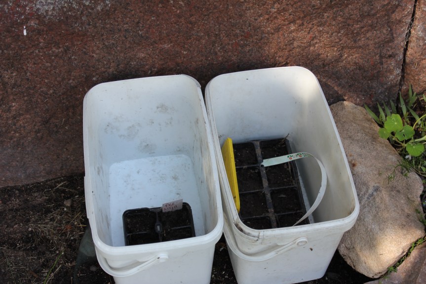 Nya sådder skyddas mot sniglar med hjälp av hinkar.