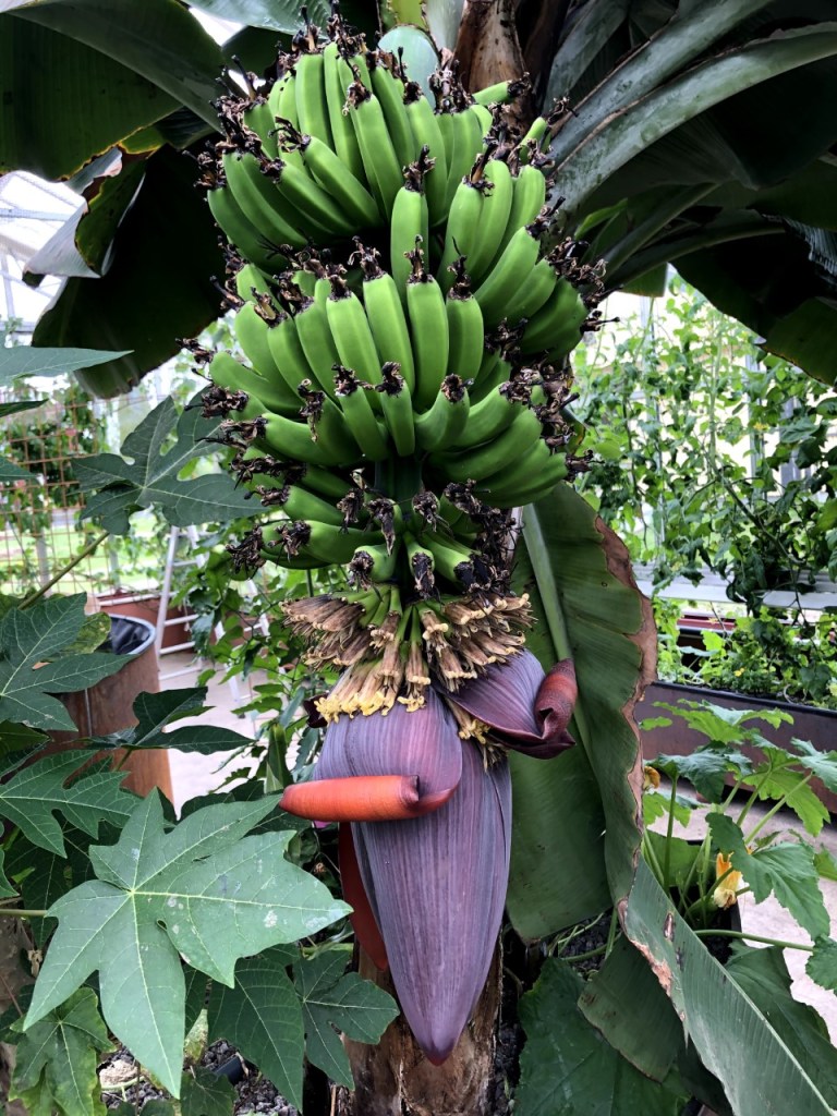 Akvaponik är ett hållbart matproduktionssystem som kombinerar fisk- och växtodling. Här används biokol som filtersystem till fiskodlingen och växterna odlas direkt i det näringsrika biokolet. Här växer både passionsfrukt och bananer!