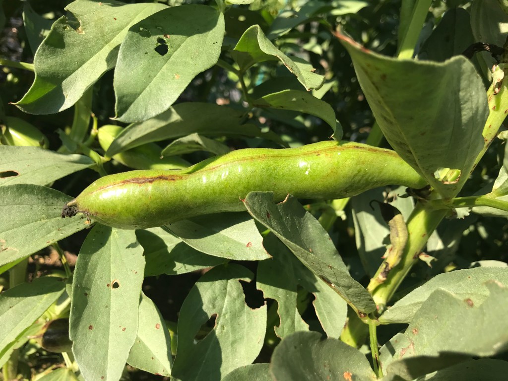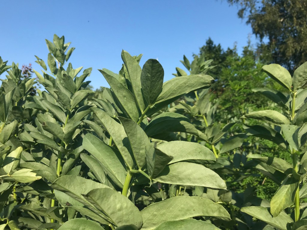 Jag odlar bondbönor på andra ställen också och har sått dem vid olika tider för att få utspridd skörd. En bädd i intensiva grönsakslandet med god trädgårdsjord såddes med bondbönor i början av maj. Där blev hela plantorna fulla med bladlöss i samband med blomningen så att bönämnena förstördes och det nästan inte blir någon skörd alls. På ett annat ställe i den fyraåriga växtföljden blir det bönor men de har tendens att lägga sig ner. Förmodligen ”bortskämda” med för mycket vatten och näring. Så slutsatsen för i år är att bondbönor är en pionjärväxt, perfekt att odla när ny mark tas i anspråk.