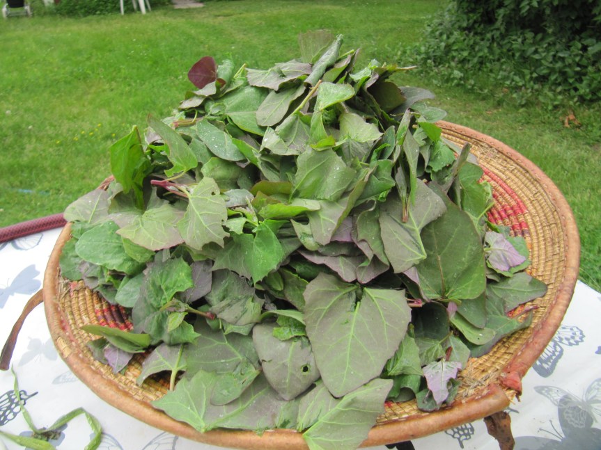 Bild (ovan): Det är hög tid att rensa/skörda för amaranten har börjat konkurrera lite väl mycket med bönorna om utrymme och ljus. Amarant är en extremt näringsrik bladgrönsak som vi hittills har använt som rött pynt i sallader eller blandat in i en wook. Men nu när det är så gott om dem (eftersom de har börjat odla sig själva) har vi också kommit på att blanda in förvällda blad i färsen till bönbiffar. Biffarna blir härligt röda och laddade med nyttigheter.