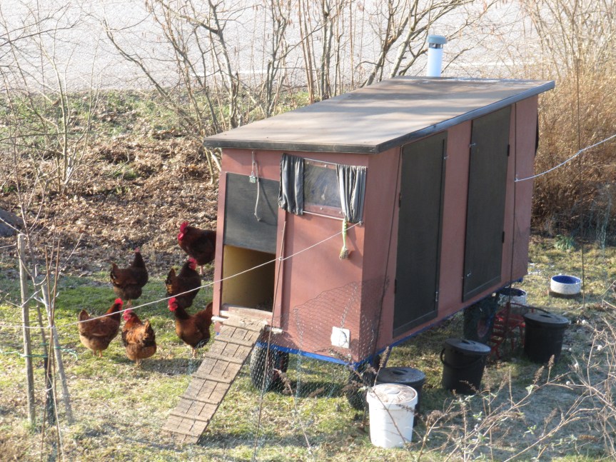 Nu har det flyttbara hönshuset lämnat växthuset och placerats ute i trädgården. För hönsen blev det ett ”nerbyt” både för att kylan kom tillbaka den här veckan och för att de nu inte längre kan röra sig helt fritt i trädgården utan är inhängnade med ett flyttbart staket. Det blev nödvändigt eftersom deras jordbearbetning på vissa känsliga ställen blev lite väl intensiv… Nu ägnar de sig istället åt mossrivning på ”anvisad plats”. Under hela sommaren kommer de flyttas runt i trädgården och alltid få färskt gräs och nya spännande buskar att gömma sig under.
